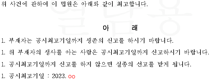 > 그 외 실종을 증명할가족(2명)의 인우보증서, 인감증명서, 실종자와 관계를 소명할 가족관계증명서, 제적등본을 제출해야 한다.